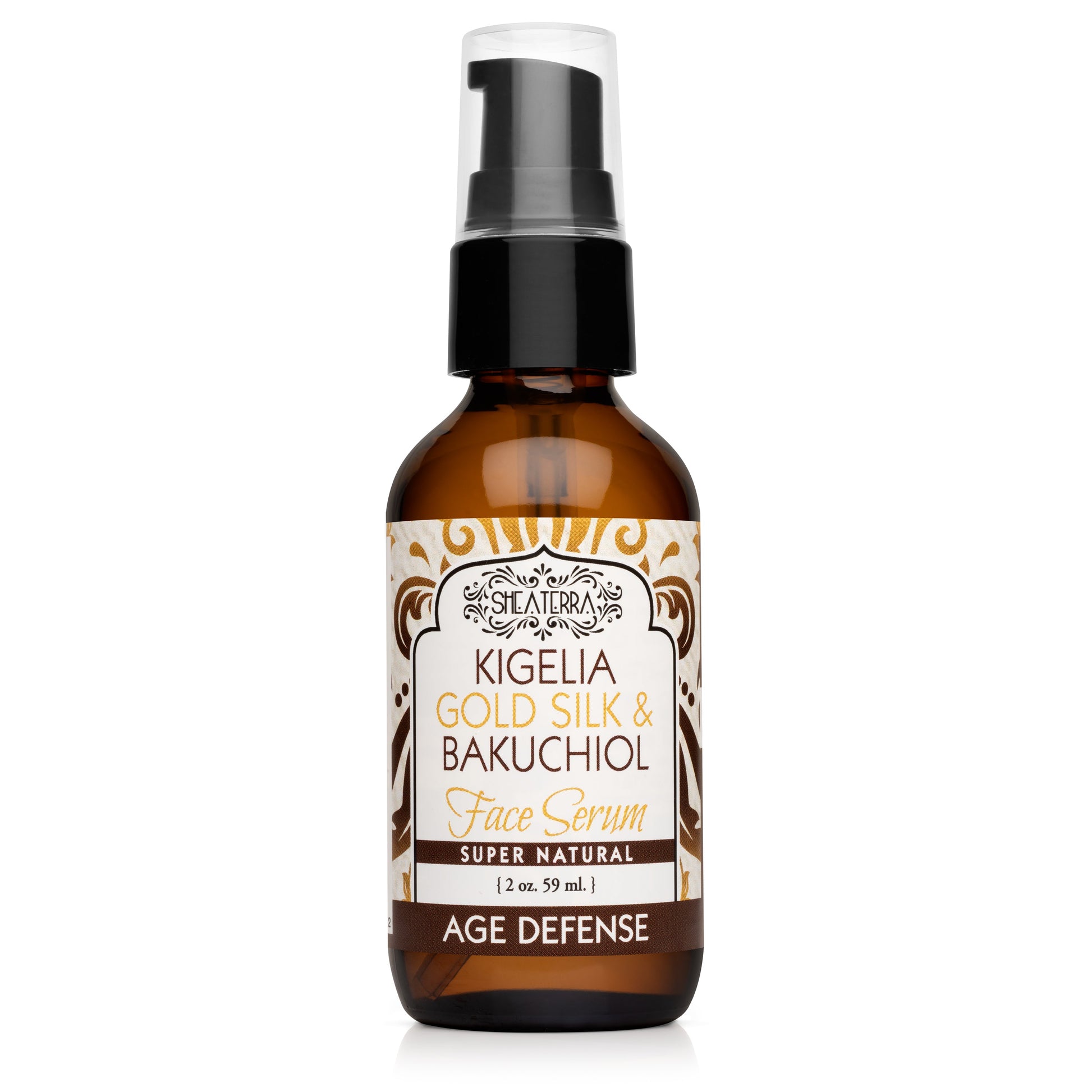 Kigelia Gold Silk & Bakuchiol Face Serum utilizes an effective, all-natural plant solvent to extract the anti-aging constituents of our botanical superstars. Kigelia Africana fruit aids in plumping cells creating skin with a more youthful appearance. African aloe, the world's most active aloe, forms the base of this hydrating serum. Pure leaf gel of the African aloe plant provides deep cell hydration and reparative properties. Kigelia Gold Silk & Bakuchiol Face Serum performs miracles around the eyes, under the chin, and on sagging skin.