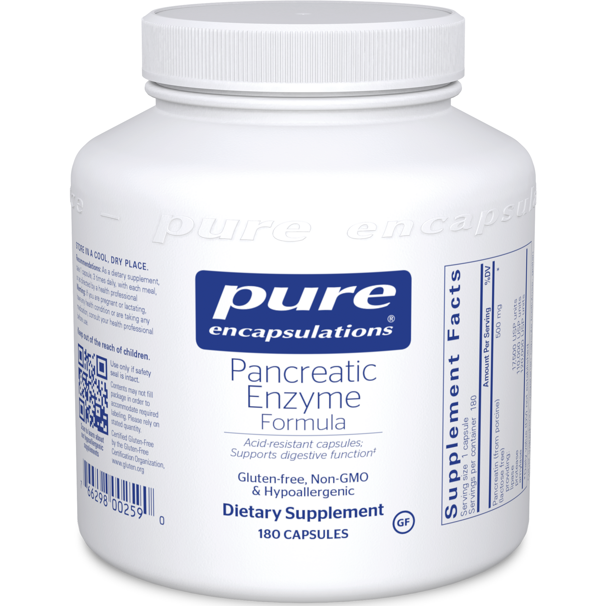 This formula is designed to aid the body's natural digestive process. It provides a highly concentrated form of enzymes naturally secreted by the pancreas which are essential to the digestion of food and absorption of nutrients. The formula contains lipase, which digests fat; proteases, which digest protein; and amylases, which digest starch. This formula is offered in acid-resistant capsules to maximize deliveryto the G.I. tract.*