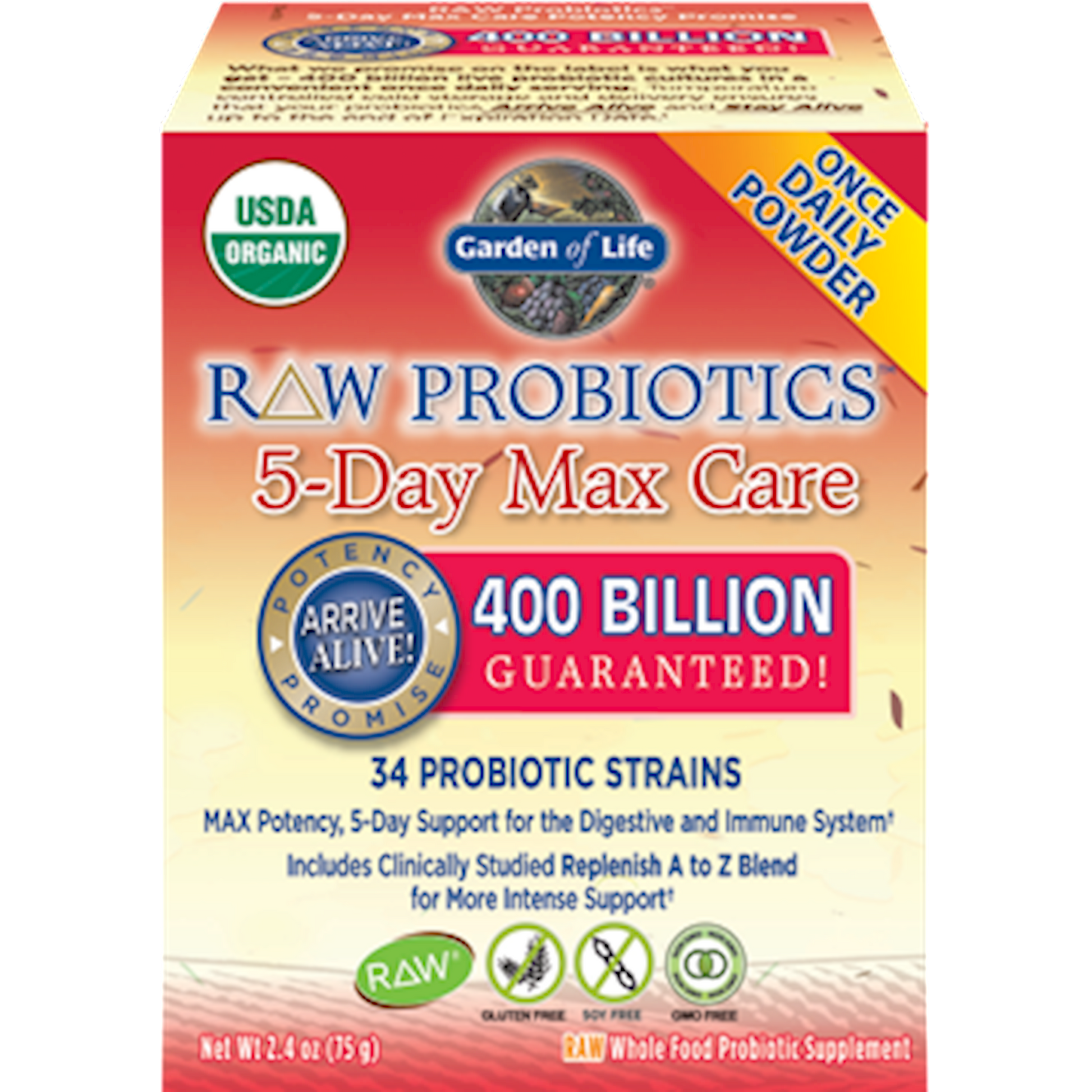 RAW Probiotics-5-Day Max Care-a unique High-Bifido formula that includes the clinically studied Replenish A to Z Blend, making it your ultimate complementary probiotic to help support balance and repopulate your gastrointestinal tract with good bacteria.*
