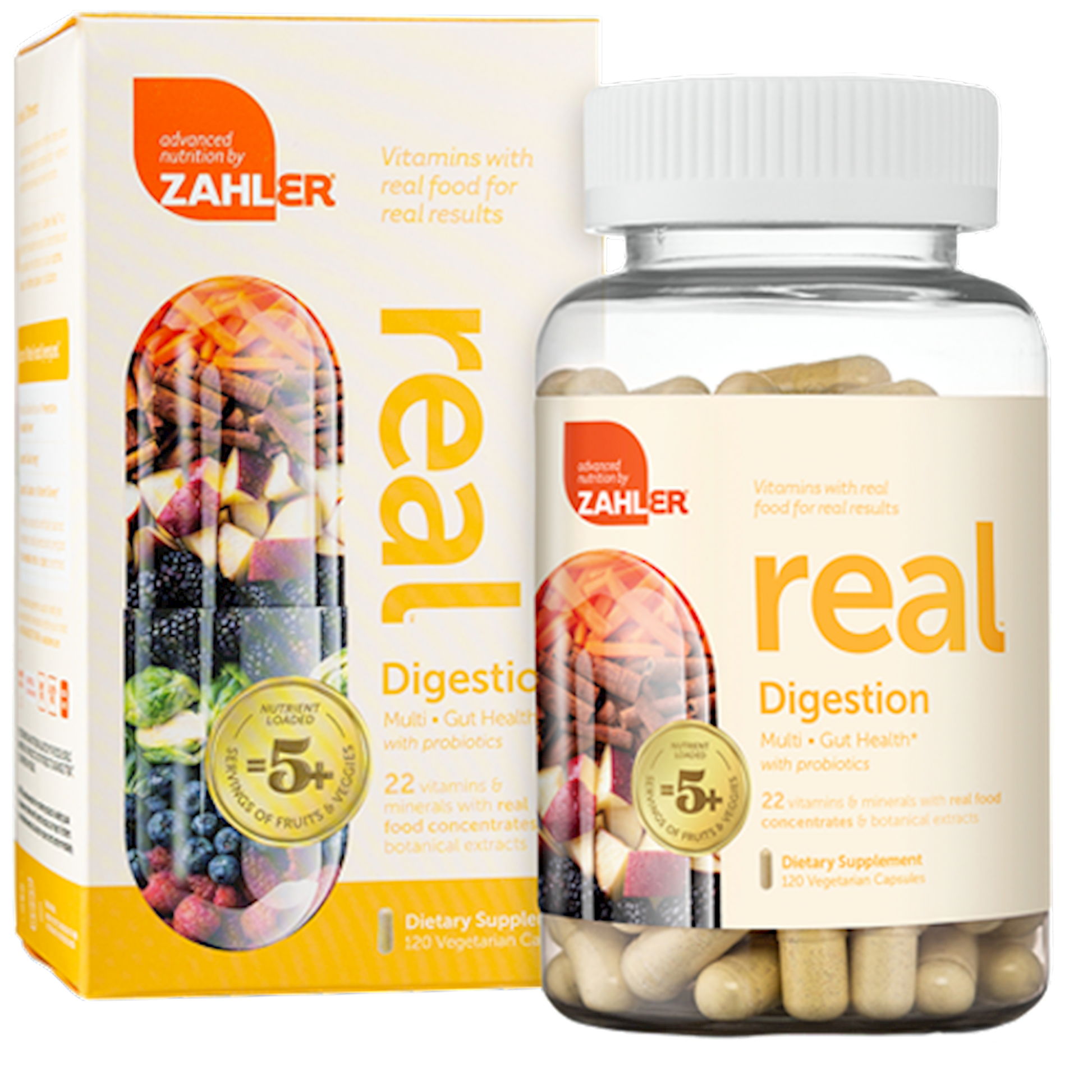 Zahler Real Digestion Multi is an exclusive multivitamin formula made with superior ingredients from superior sources. In addition to having all the benefits of a regular multivitamin, included are 5 servings of fruits and veggies and additional nutrients such as Probiotics, Artichoke Leaf and more to support digestion.