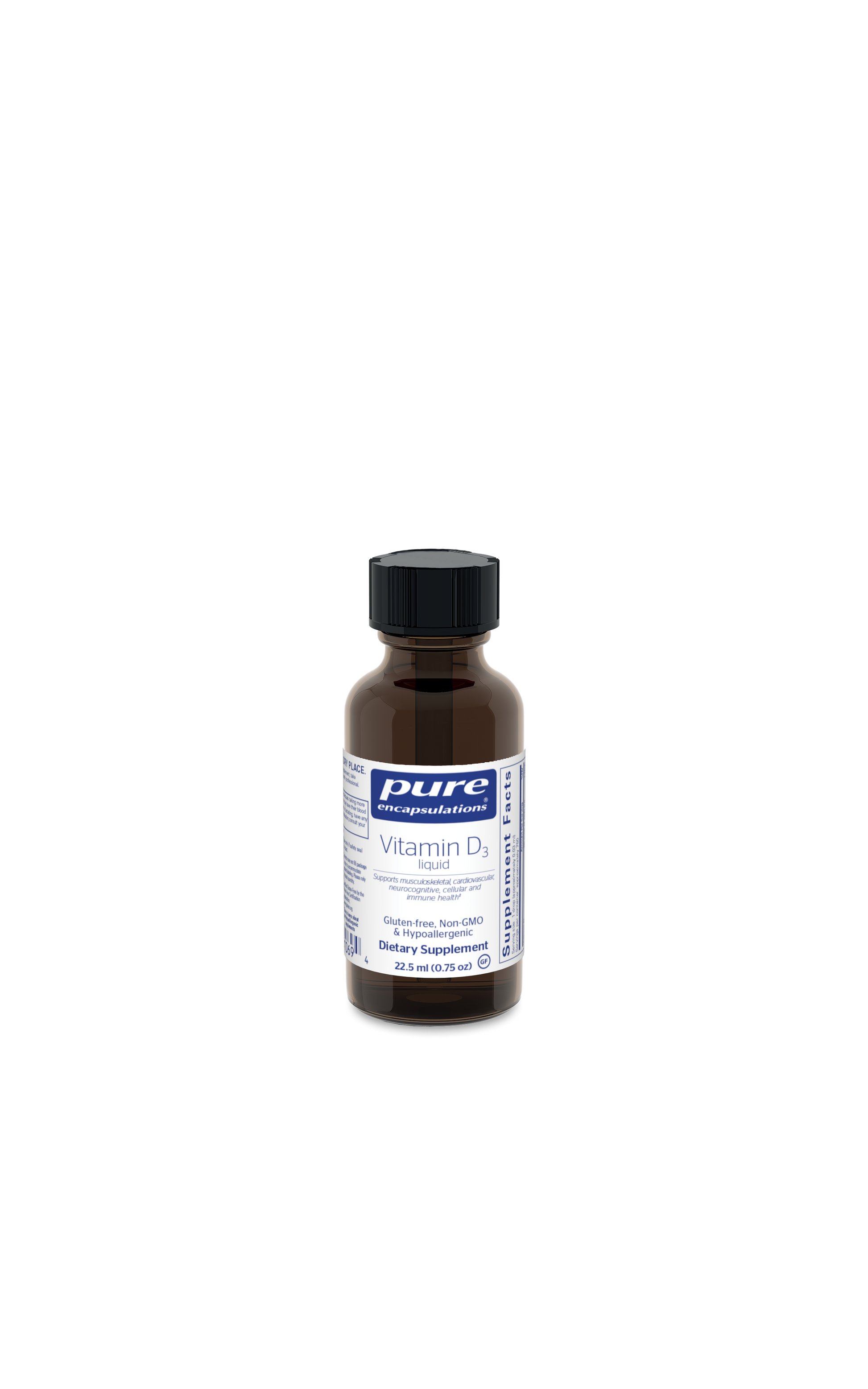 Pure Encapsulations Vitamin D3 liquid provides 25 mcg (1,000 IU) per drop. For individuals with greater short-term needs, this product allows for achieving 625-1,250 mcg (25,000-50,000 IU) vitamin D3 per week without having to take multiple capsules. For the elderly, Vitamin D3 liquid is an easy-to-use form. Vitamin D3 is offered in a base of medium chain triglycerides to support absorption. Vitamin D3 liquid is also free of preservatives, artificial colors, flavors and sugars.*